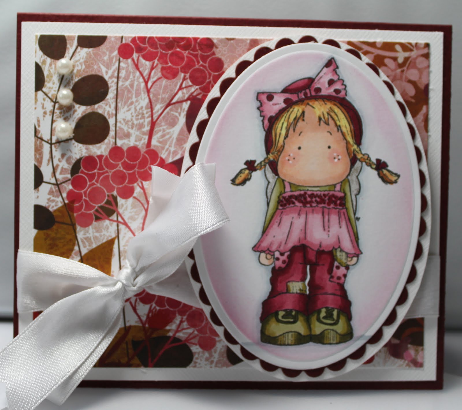 Just finished this card and pleased with the results except for a little smudging I hadn't planned on and if I did it again I would move the image and the patterned paper it is on down some more. It seems a little top heavy to me. Anyway, the image is a Magnolia stamp called "Standing Tilda with Hair Bow". It was stamped with Memento Tuxedo Black ink and then coloured with copics - E11,E00,E000,R20,E49,E59,E25,E53,E41,E42,E43,E44,Y21,Y23,Y26,YR23,YG99,YG95,YG93,YG91. Then the image was cut and embossed using Spellbinders Nestabilities Petite Oval Small. The inside edges were sponged with Versa Magic Sage and the edges of the papers were rubbed with Memento Rich Cocoa. The patterned papers were from My Mind's Eye "Home" collection. The orange paper was embossed with my cuttlebug and the swiss dot folder. The green polka dot paper was cut with Spellbinder's nestablilities scalloped ovals. The base of the card is a green Bazzill cardstock. I embellished with Prima flowers, the leaves and pearls spray were from the dollar store, and the the green half pearls are from Basic Grey Opaline collection.
